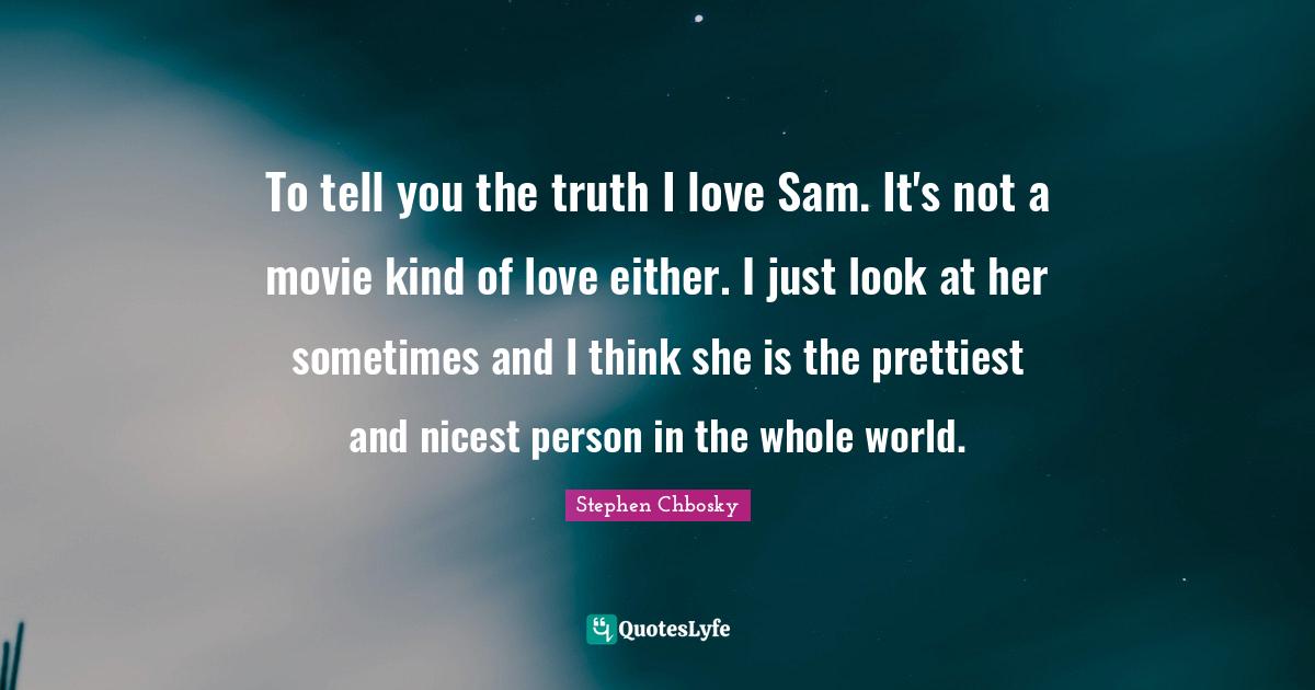 This page presents the quote "To tell you the truth I love Sam. It's not a movie kind of love either. I just look at her sometimes and I think she is the prettiest and nicest person in the whole world.". Author of this quote is Stephen Chbosky. This quote is about love, truth, whole world, looks, movie, thinking, sometimes, kind, prettiest,.