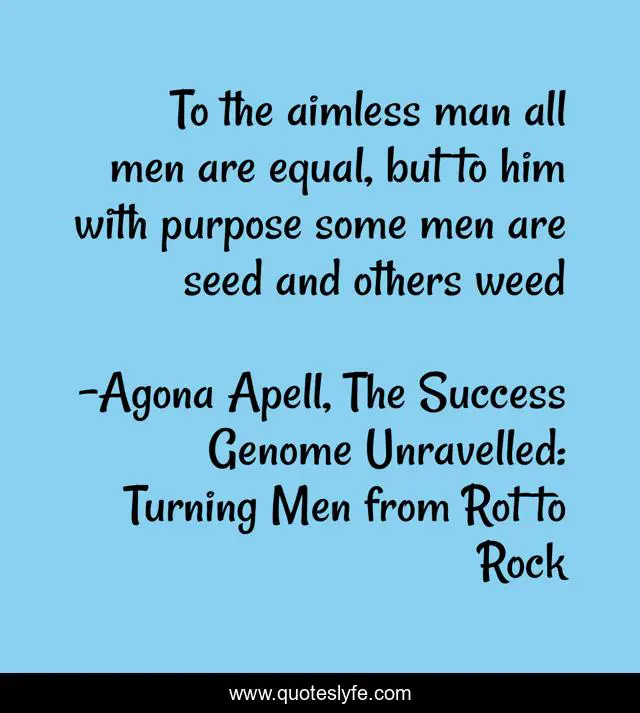 This page presents the quote "To the aimless man all men are equal, but to him with purpose some men are seed and others weed". Author of this quote is Agona Apell, The Success Genome Unravelled: Turning Men from Rot to Rock. This quote is about quotes, goals, success, quotes-to-live-by,.