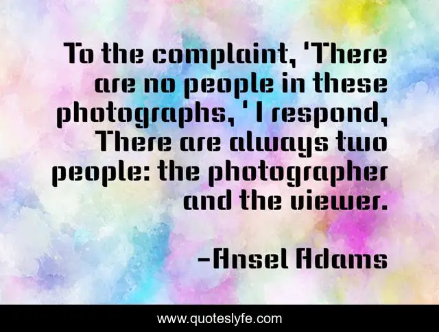 This page presents the quote "To the complaint, 'There are no people in these photographs, ' I respond, There are always two people: the photographer and the viewer.". Author of this quote is Ansel Adams. This quote is about photography, landscapes, landscape,.