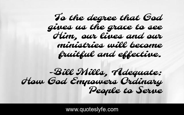 This page presents the quote "To the degree that God gives us the grace to see Him, our lives and our ministries will become fruitful and effective.". Author of this quote is Bill Mills, Adequate: How God Empowers Ordinary People to Serve. This quote is about grace-of-god, fruitful-ministry, grace, god-s-grace, christian-ministry,.