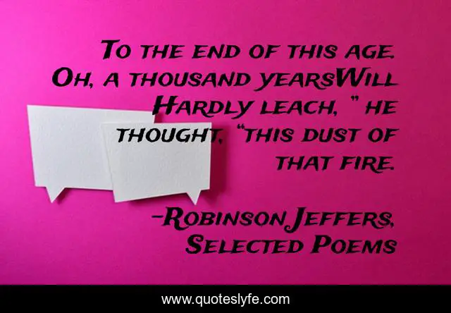 This page presents the quote "To the end of this age. Oh, a thousand yearsWill Hardly leach, ” he thought, “this dust of that fire.". Author of this quote is Robinson Jeffers, Selected Poems. .