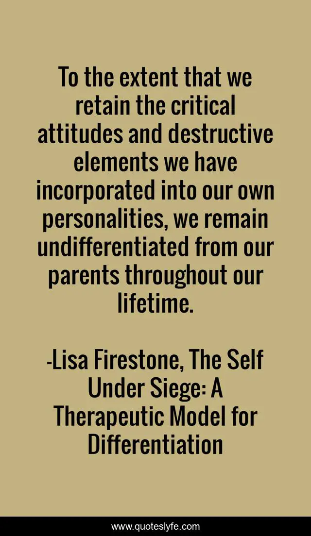 This page presents the quote "To the extent that we retain the critical attitudes and destructive elements we have incorporated into our own personalities, we remain undifferentiated from our parents throughout our lifetime.". Author of this quote is Lisa Firestone, The Self Under Siege: A Therapeutic Model for Differentiation. This quote is about developmental-psychology, self, self-help,.