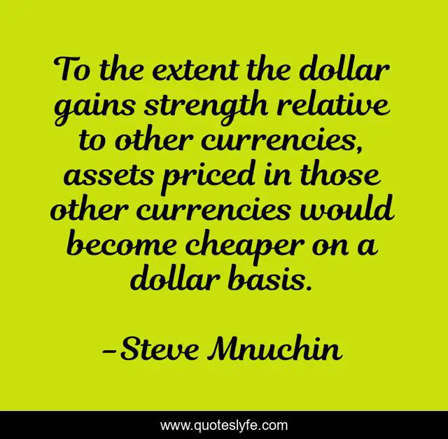 This page presents the quote "To the extent the dollar gains strength relative to other currencies, assets priced in those other currencies would become cheaper on a dollar basis.". Author of this quote is Steve Mnuchin. This quote is about become, dollar, assets,.