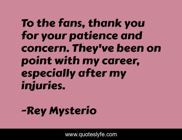 This page presents the quote "To the fans, thank you for your patience and concern. They've been on point with my career, especially after my injuries.". Author of this quote is Rey Mysterio. This quote is about thank you, injuries,.