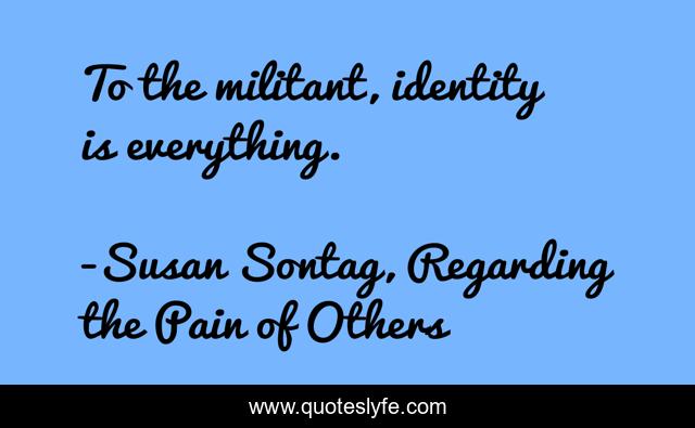 "Susan Sontag, Regarding the Pain of Others Quotes." Quoteslyfe.com, 2025. Fri. 05 Dec. 2025. <https://www.quoteslyfe.com/quote/To-the-militant-identity-is-everything-52410>.
