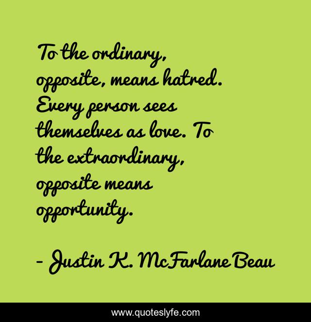 This page presents the quote "To the ordinary, opposite, means hatred. Every person sees themselves as love. To the extraordinary, opposite means opportunity.". Author of this quote is Justin K. McFarlane Beau. This quote is about love, optimism, chance, growth, change, learning, rare, hatred, opportunity,.