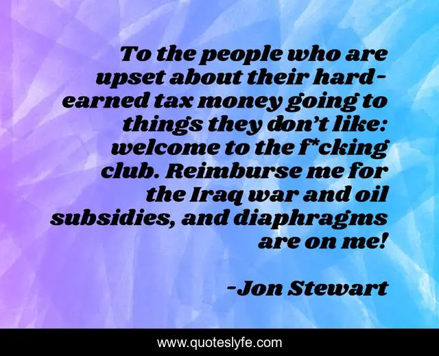 This page presents the quote "To the people who are upset about their hard-earned tax money going to things they don’t like: welcome to the f*cking club. Reimburse me for the Iraq war and oil subsidies, and diaphragms are on me!". Author of this quote is Jon Stewart. This quote is about government-spending, tax, democracy, government,.