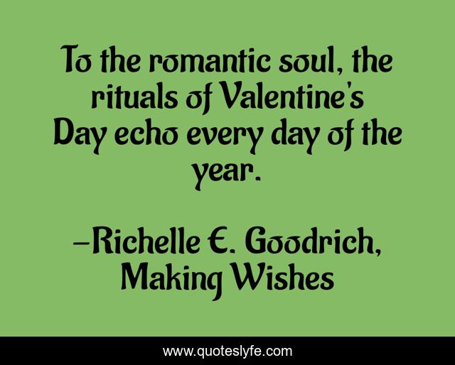 This page presents the quote "To the romantic soul, the rituals of Valentine's Day echo every day of the year.". Author of this quote is Richelle E. Goodrich, Making Wishes. This quote is about valentine-s-day, love, romantic, richelle-e-goodrich, valentine, romance, richelle, valentines-day, richelle-goodrich,.