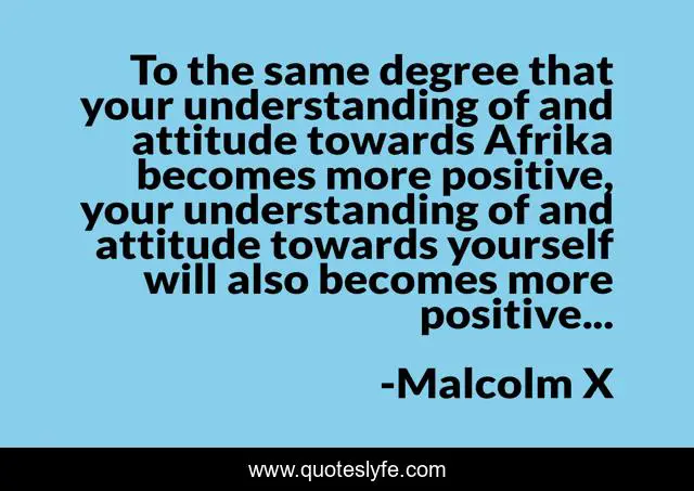 This page presents the quote "To the same degree that your understanding of and attitude towards Afrika becomes more positive, your understanding of and attitude towards yourself will also becomes more positive...". Author of this quote is Malcolm X. This quote is about africa, malcolm, afrika, identity,.