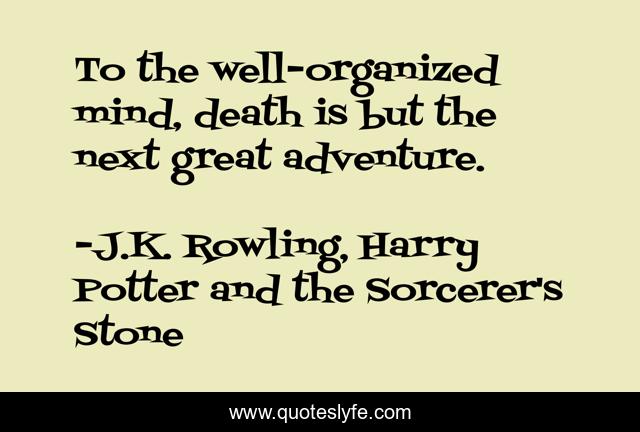 This page presents the quote "To the well-organized mind, death is but the next great adventure.". Author of this quote is J.K. Rowling, Harry Potter and the Sorcerer's Stone. This quote is about enthusiasm, death, inspirational,.