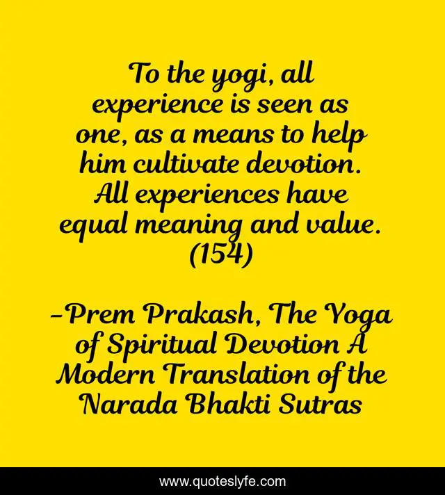 This page presents the quote "To the yogi, all experience is seen as one, as a means to help him cultivate devotion. All experiences have equal meaning and value. (154)". Author of this quote is Prem Prakash, The Yoga of Spiritual Devotion A Modern Translation of the Narada Bhakti Sutras. This quote is about yoga, devotion, experience,.