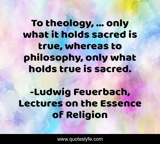 This page presents the quote "To theology, ... only what it holds sacred is true, whereas to philosophy, only what holds true is sacred.". Author of this quote is Ludwig Feuerbach, Lectures on the Essence of Religion. This quote is about theology, philosophy, true, sacred, wisdom,.