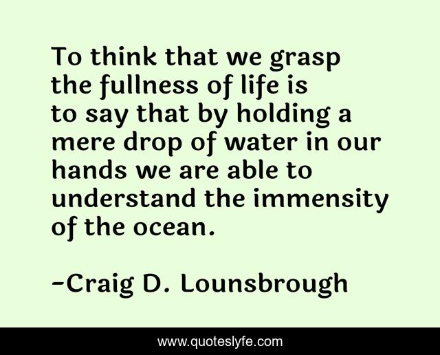 This page presents the quote "To think that we grasp the fullness of life is to say that by holding a mere drop of water in our hands we are able to understand the immensity of the ocean.". Author of this quote is Craig D. Lounsbrough. This quote is about limited, hands, comprehension, existence, living, knowledge, short-sighted, immense, limitations,.