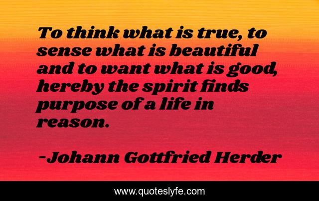 This page presents the quote "To think what is true, to sense what is beautiful and to want what is good, hereby the spirit finds purpose of a life in reason.". Author of this quote is Johann Gottfried Herder. This quote is about beautiful, life, meaning, reason, purpose, inspirational, enthusiasm, meaning-of-life, purpose-of-life,.