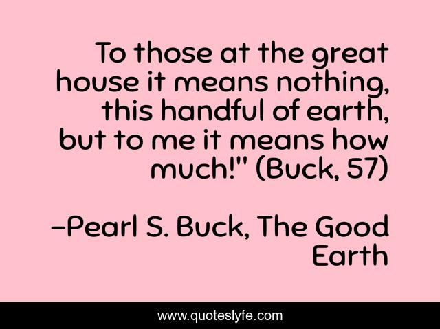 This page presents the quote "To those at the great house it means nothing, this handful of earth, but to me it means how much!" (Buck, 57)". Author of this quote is Pearl S. Buck, The Good Earth. This quote is about pearl-s-buck, land, nature, the-good-earth, earth, man,.