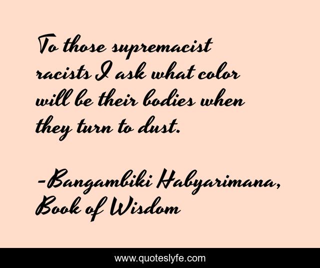 This page presents the quote "To those supremacist racists I ask what color will be their bodies when they turn to dust.". Author of this quote is Bangambiki Habyarimana, Book of Wisdom. This quote is about race-relations, prejudice, racism, racism-and-culture, racist,.