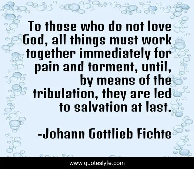 This page presents the quote "To those who do not love God, all things must work together immediately for pain and torment, until, by means of the tribulation, they are led to salvation at last.". Author of this quote is Johann Gottlieb Fichte. This quote is about work, love, together, affection,.