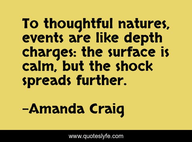 This page presents the quote "To thoughtful natures, events are like depth charges: the surface is calm, but the shock spreads further.". Author of this quote is Amanda Craig. This quote is about reactions, trauma, thoughtfulness,.