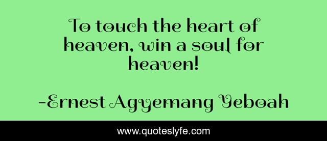 This page presents the quote "To touch the heart of heaven, win a soul for heaven!". Author of this quote is Ernest Agyemang Yeboah. This quote is about soul-winning, christian-walk, heaven, evangelism,.