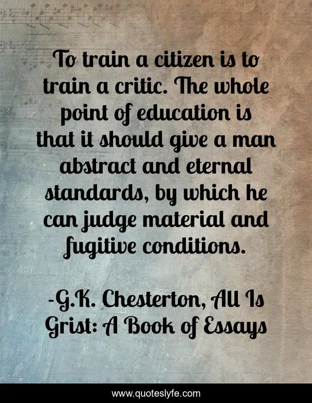 This page presents the quote "To train a citizen is to train a critic. The whole point of education is that it should give a man abstract and eternal standards, by which he can judge material and fugitive conditions.". Author of this quote is G.K. Chesterton, All Is Grist: A Book of Essays. This quote is about criticism, education, values, morals, standards,.
