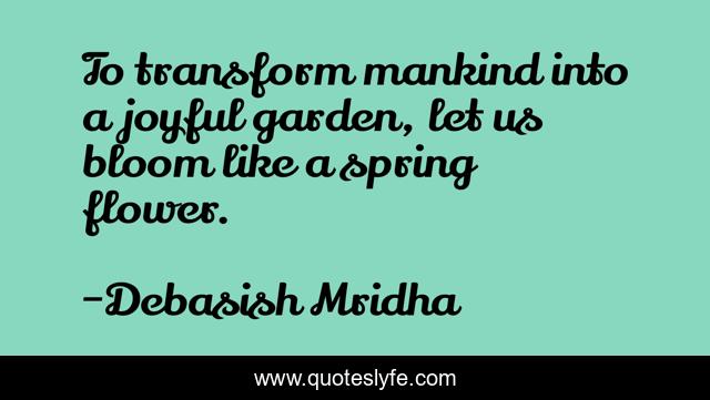 This page presents the quote "To transform mankind into a joyful garden, let us bloom like a spring flower.". Author of this quote is Debasish Mridha. This quote is about quotes, transform-mankind, philosophy, debasish-mridha, spring-flower, joyful-garden, inspirational, enthusiasm, debasish-mridha-m-d,.