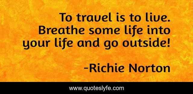 This page presents the quote "To travel is to live. Breathe some life into your life and go outside!". Author of this quote is Richie Norton. This quote is about confidence, self-mastery, mindful, marketing, work, success, self-help, entrepreneur, innovation,.