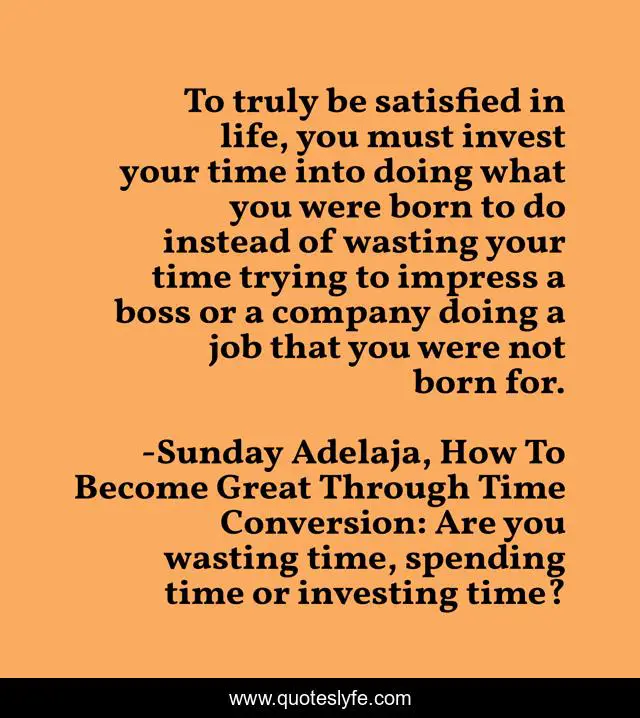 This page presents the quote "To truly be satisfied in life, you must invest your time into doing what you were born to do instead of wasting your time trying to impress a boss or a company doing a job that you were not born for.". Author of this quote is Sunday Adelaja, How To Become Great Through Time Conversion: Are you wasting time, spending time or investing time?. This quote is about life, satisfaction, impressions, calling, investment, conversion, productivity, wealth, time-investment,.