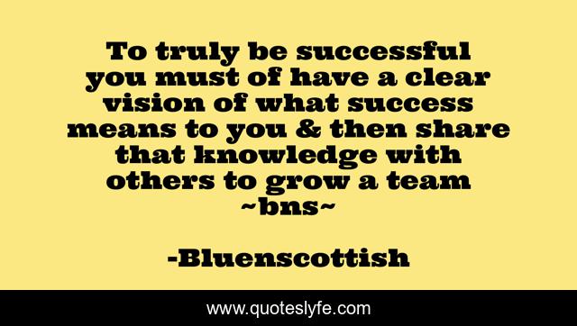 This page presents the quote "To truly be successful you must of have a clear vision of what success means to you & then share that knowledge with others to grow a team ~bns~". Author of this quote is Bluenscottish. This quote is about bluenscottish, leadership, teamwork, success, vision,.