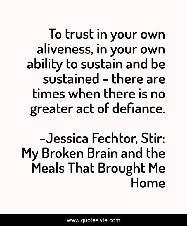 "Jessica Fechtor, Stir: My Broken Brain and the Meals That Brought Me Home Quotes." Quoteslyfe.com, 2025. Fri. 05 Dec. 2025. <https://www.quoteslyfe.com/quote/To-trust-in-your-own-aliveness-in-57972>.