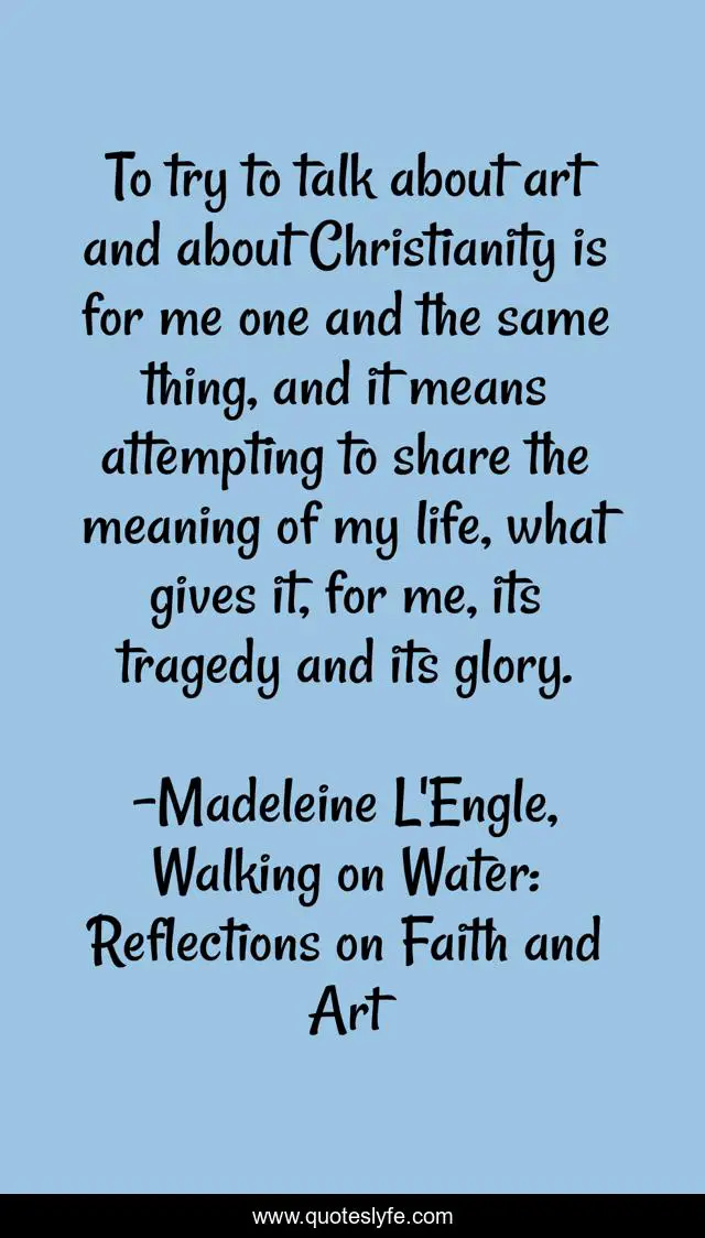 This page presents the quote "To try to talk about art and about Christianity is for me one and the same thing, and it means attempting to share the meaning of my life, what gives it, for me, its tragedy and its glory.". Author of this quote is Madeleine L'Engle, Walking on Water: Reflections on Faith and Art. This quote is about faith, meaning, art, meaningful, christianity,.