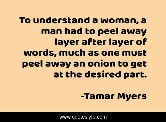 This page presents the quote "To understand a woman, a man had to peel away layer after layer of words, much as one must peel away an onion to get at the desired part.". Author of this quote is Tamar Myers. This quote is about africa, belgian-congo,.