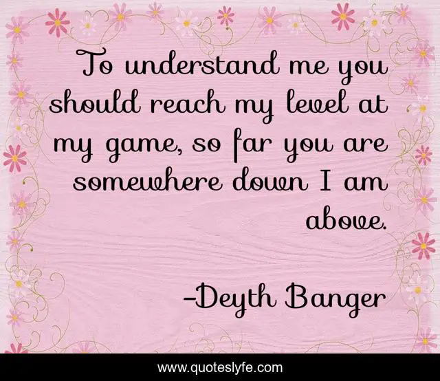 This page presents the quote "To understand me you should reach my level at my game, so far you are somewhere down I am above.". Author of this quote is Deyth Banger. This quote is about me, i, understand, above, to,.