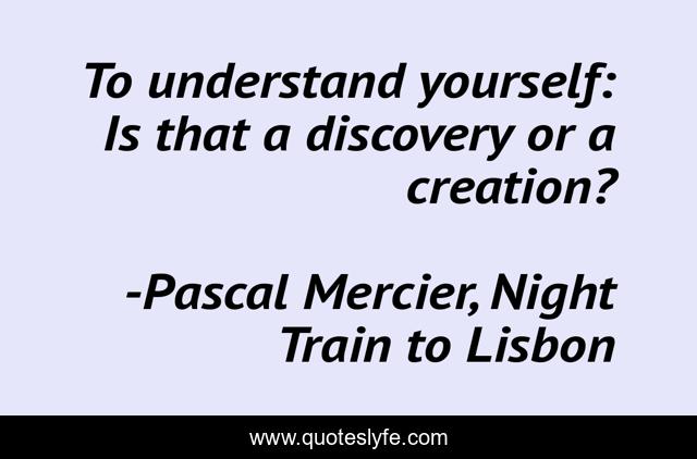 "Pascal Mercier, Night Train to Lisbon Quotes." Quoteslyfe.com, 2025. Fri. 05 Dec. 2025. <https://www.quoteslyfe.com/quote/To-understand-yourself-Is-that-a-discovery-156998>.