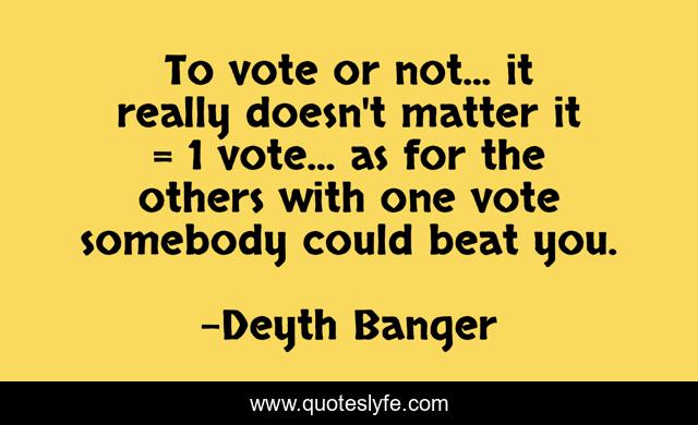 This page presents the quote "To vote or not... it really doesn't matter it = 1 vote... as for the others with one vote somebody could beat you.". Author of this quote is Deyth Banger. This quote is about beat, matter, could,.