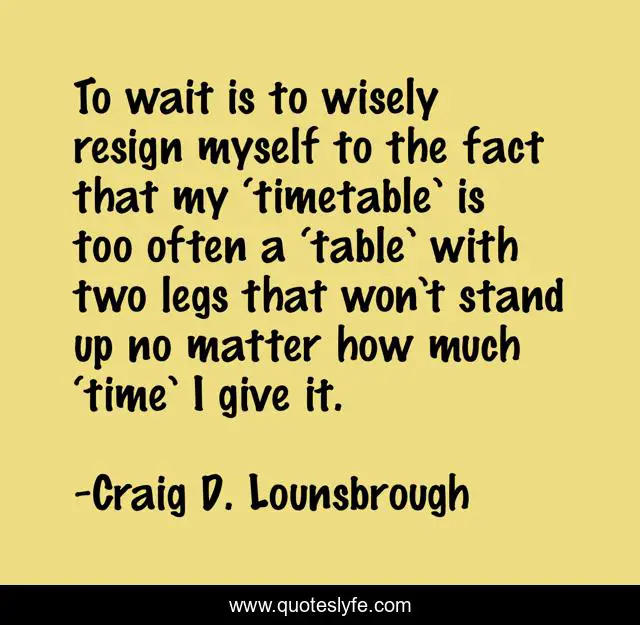 This page presents the quote "To wait is to wisely resign myself to the fact that my ‘timetable’ is too often a ‘table’ with two legs that won’t stand up no matter how much ‘time’ I give it.". Author of this quote is Craig D. Lounsbrough. This quote is about patient, impatience, plans, resign, impatient, patience, waiting, time, timetable,.