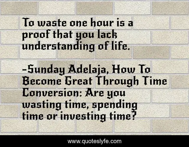 This page presents the quote "To waste one hour is a proof that you lack understanding of life.". Author of this quote is Sunday Adelaja, How To Become Great Through Time Conversion: Are you wasting time, spending time or investing time?. This quote is about life, conversion, productivity, wealth, time-wastage, greatness, waste, humanity, wasting-time,.