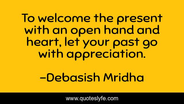 This page presents the quote "To welcome the present with an open hand and heart, let your past go with appreciation.". Author of this quote is Debasish Mridha. This quote is about miraboli, oscar-wilde, let-your-past-go, philosophy, debasish-mridha, tagore, quotes, buddha, debasish-mridha-md,.