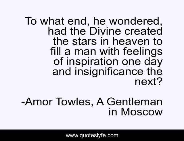 This page presents the quote "To what end, he wondered, had the Divine created the stars in heaven to fill a man with feelings of inspiration one day and insignificance the next?". Author of this quote is Amor Towles, A Gentleman in Moscow. This quote is about heaven, stars, wonder,.