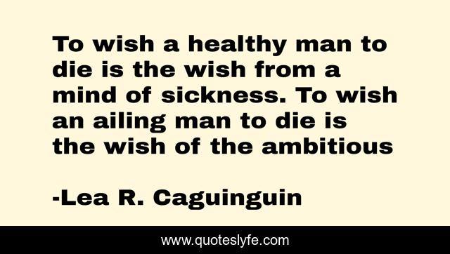 This page presents the quote "To wish a healthy man to die is the wish from a mind of sickness. To wish an ailing man to die is the wish of the ambitious". Author of this quote is Lea R. Caguinguin. This quote is about health, sickness,.