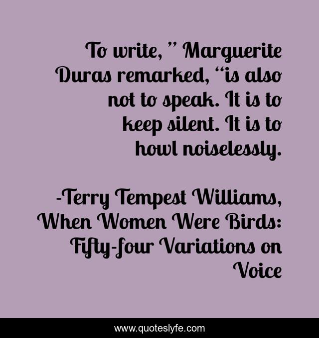 This page presents the quote "To write, ” Marguerite Duras remarked, “is also not to speak. It is to keep silent. It is to howl noiselessly.". Author of this quote is Terry Tempest Williams, When Women Were Birds: Fifty-four Variations on Voice. This quote is about voice, howl, silence, silent,.