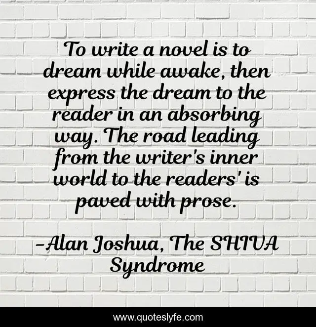 This page presents the quote "To write a novel is to dream while awake, then express the dream to the reader in an absorbing way. The road leading from the writer's inner world to the readers' is paved with prose.". Author of this quote is Alan Joshua, The SHIVA Syndrome. This quote is about science-fiction, writers-on-writing, metaphysical, paranormal, thriller,.