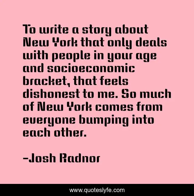 This page presents the quote "To write a story about New York that only deals with people in your age and socioeconomic bracket, that feels dishonest to me. So much of New York comes from everyone bumping into each other.". Author of this quote is Josh Radnor. This quote is about me, new york, people,.