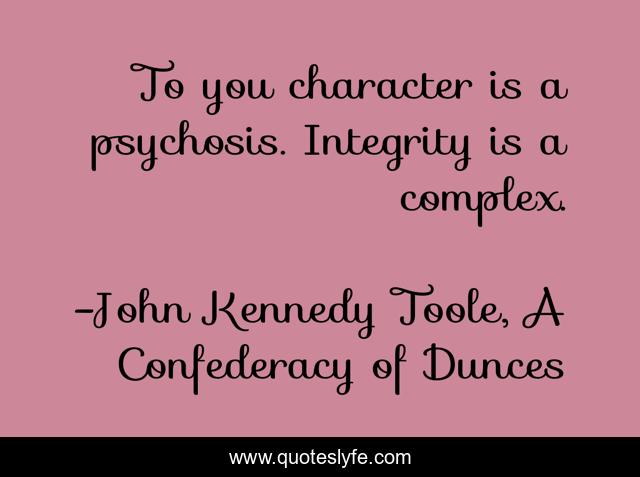 This page presents the quote "To you character is a psychosis. Integrity is a complex.". Author of this quote is John Kennedy Toole, A Confederacy of Dunces. This quote is about character, integrity,.