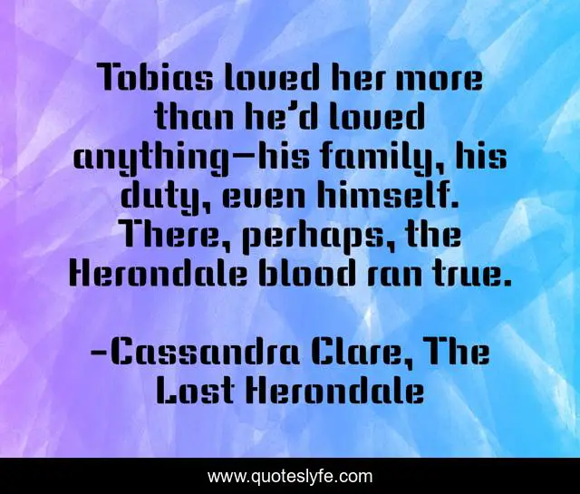 This page presents the quote "Tobias loved her more than he’d loved anything—his family, his duty, even himself. There, perhaps, the Herondale blood ran true.". Author of this quote is Cassandra Clare, The Lost Herondale. This quote is about duty, love, family, tobias-herondale, blood, affection, herondales,.