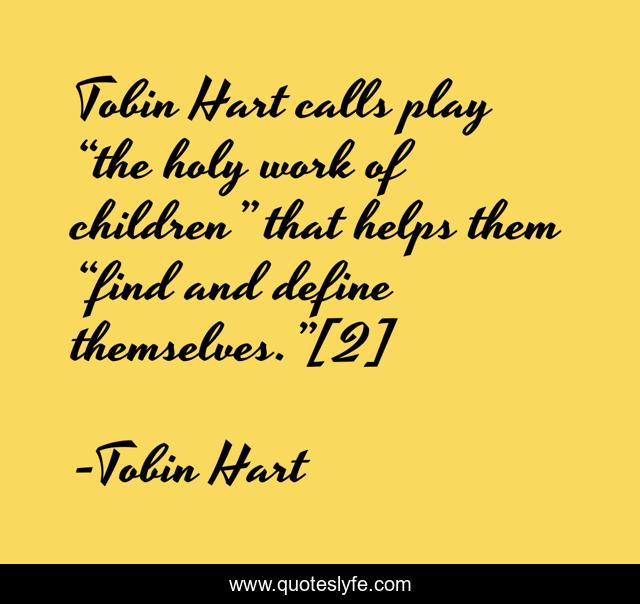 This page presents the quote "Tobin Hart calls play “the holy work of children” that helps them “find and define themselves.”[2]". Author of this quote is Tobin Hart. This quote is about fun, maturation, recreation,.