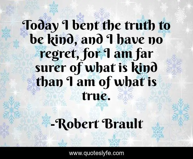This page presents the quote "Today I bent the truth to be kind, and I have no regret, for I am far surer of what is kind than I am of what is true.". Author of this quote is Robert Brault. This quote is about truthfulness, kind, truth, truth-telling, consideration, kindness,.