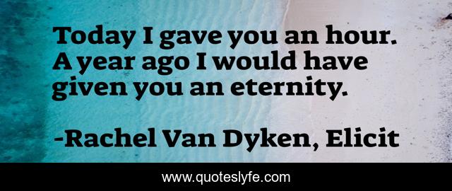 This page presents the quote "Today I gave you an hour. A year ago I would have given you an eternity.". Author of this quote is Rachel Van Dyken, Elicit. This quote is about heartbreak, love, affection,.