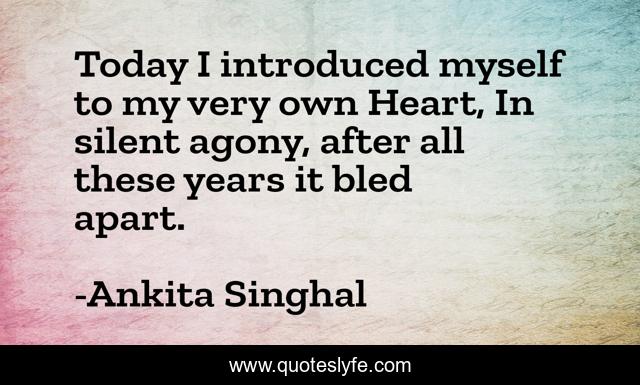 This page presents the quote "Today I introduced myself to my very own Heart, In silent agony, after all these years it bled apart.". Author of this quote is Ankita Singhal. This quote is about heart, love, silent, poem, introduction, agony, poetry, hurt, couplet,.