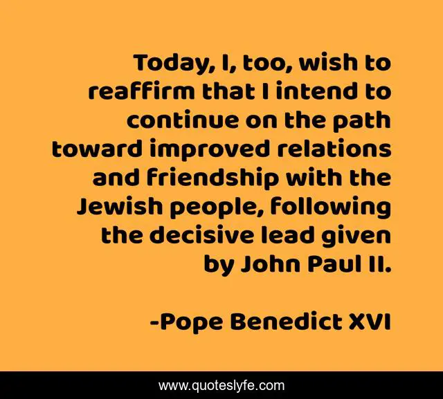 This page presents the quote "Today, I, too, wish to reaffirm that I intend to continue on the path toward improved relations and friendship with the Jewish people, following the decisive lead given by John Paul II.". Author of this quote is Pope Benedict XVI. This quote is about path, today, people,.