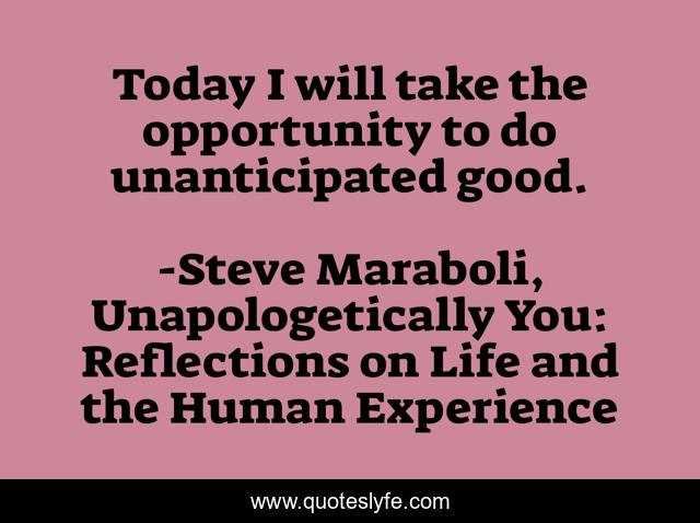 This page presents the quote "Today I will take the opportunity to do unanticipated good.". Author of this quote is Steve Maraboli, Unapologetically You: Reflections on Life and the Human Experience. This quote is about good, compassion, inspirational, enthusiasm, kindness, opportunity,.